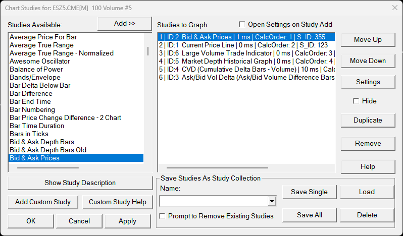 Im not able to see the bid/ask price lines on chart when I enable the "Bid Ask prices" study, Im also not able to see my large trades when I enable the "Large Volume trade indicator"