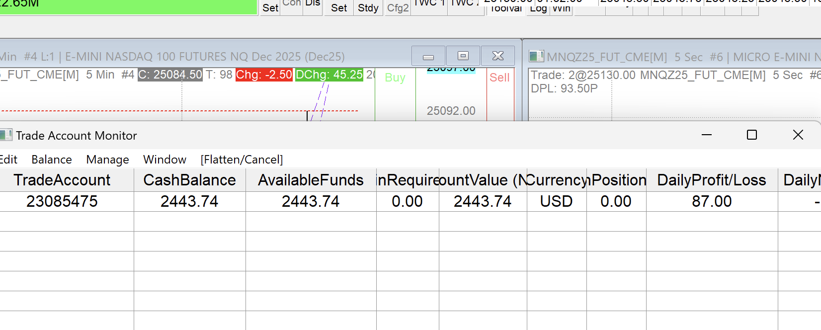Good day I encountered an error that started yesterday wherein the displayed DPL did not match the actual records found in the trading account monitor and trading activity log. The DPL has been set to display points, not currency value. It shows 93.5 points on a micro NQ contract, while activity log as well as account monitor show 87 USD or 43.5 points. How do I correct this? |