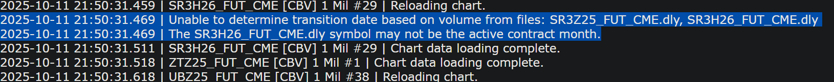 I don't believe I have any wrongly formatted symbols. If you look at the second log referencing my bond chart book with SOFR 3 month futures. Look at the screenshot below. It should not be saying, what it is saying in the log. I should be able to plot the entire SOFR curve on the same subgraph, on the same price axis, regardless of if there's been any volume or tick movement etc. regardless of 'active contract months'. regardless of transition dates. Something is fundamentally wrong with the logic If I can't plot the SOFR curve on a intraday and historical chart. Yall need to remove this logic from EVERY 'non active' futures contract in every exchange. It's called the 'FUTURES' market. If I am even right, yall wouldn't even admit where you went wrong. All my SOFR charts that I've been working on got deleted when I tried to launch my bond chartbook when I rolled back. If you guys can't allow to plot the SOFR curve through the add additional symbol study - you are not making your trading software friendly to the tools that bond traders need. Please listen to this, there are outside sierrachart user communities, and they are not optimistic about any updates. After what has has happened to me, I will join that crowd and will recommend to each and every user to not update. And yet yall are optimistic and telling us about performance improvements but yall don't run what we run, and we fall for it, and we think that applies to our huge chartbooks, and it ends up breaking everything, and usually the rollback is safe, and there is usually no memory leak, and chartbooks don't get corrupted. But not this time for me. Hey I'm sure you guys would have noticed your entire SOFR curve charts being deleted as soon as you updated versions, and wanted to test rolling back. Date Time Of Last Edit: 2025-10-12 04:44:30