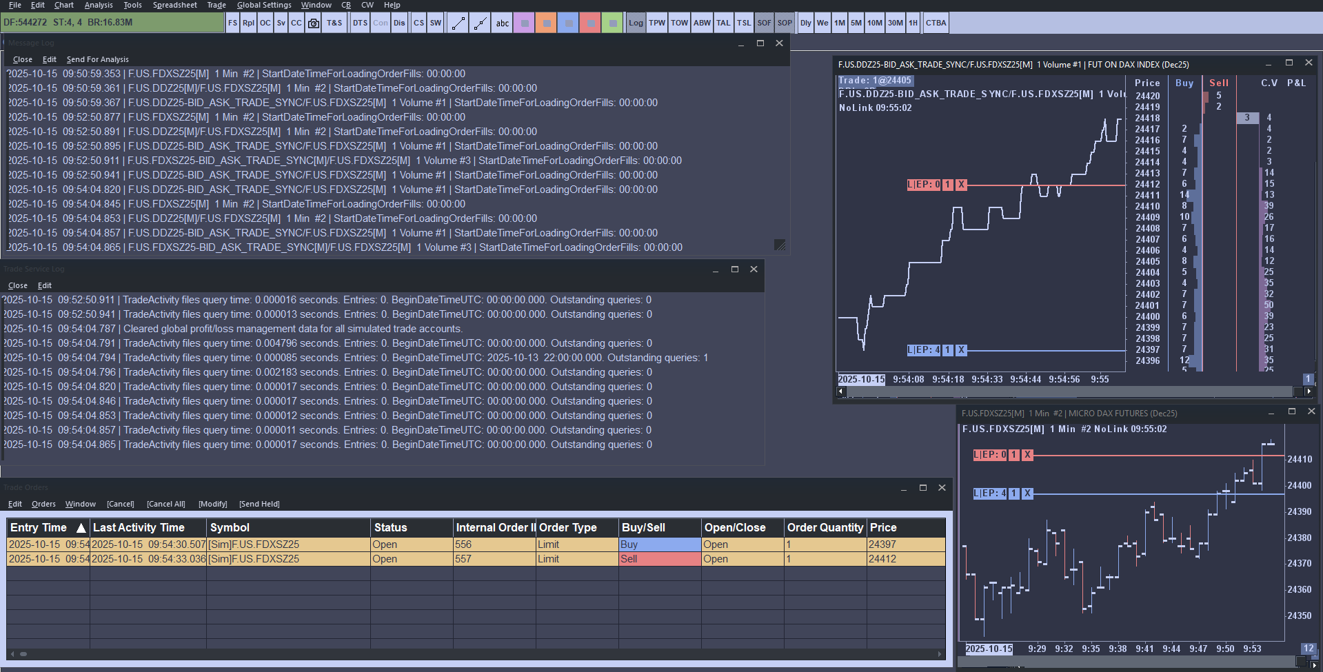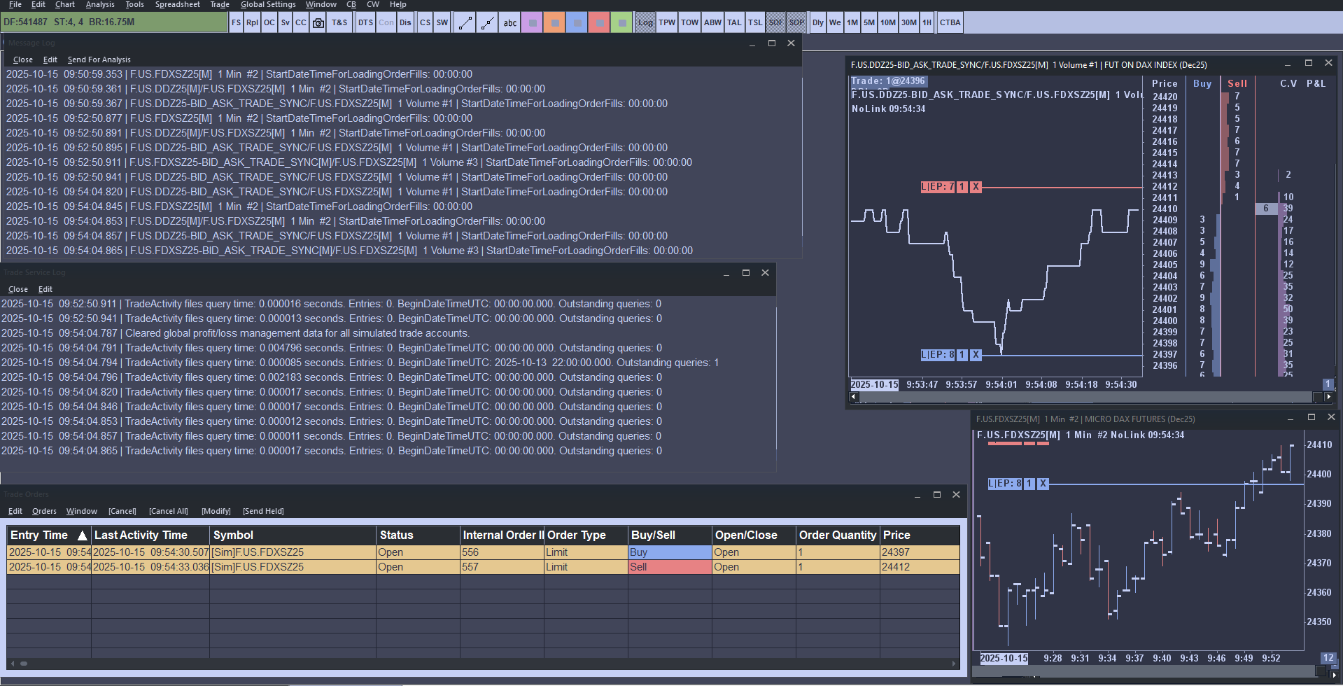 Hi. I am doing it on Simulation. (On Live trading, this works as expected but I would rather do Simulation before going live). See on the first screenshot (Capture d'écran 2025-10-15 095439.png): - On the top right, this is the F.US.DDZ25-BID_ASK_TRADE_SYNC chart with Trade symbol set up as F.US.FDXSZ25 - On the bottom right, this is F.US.FDXSZ25 to see the order applies correctly - On the bottom left, this is Trade Order Window, middle left, this is the Trade Service Log and top left the Message Log. You can see that at 9:54:30, I entered a Buy limit below current price and a Sell limit above, from the F.US.DDZ25-BID_ASK_TRADE_SYNC chart. These orders are displayed on the F.US.FDXSZ25 chart, and in the Trade Order Window. But the Trade Service Log does not show anything at that time. Then see on the second screenshot (Capture d'écran 2025-10-15 095507.png) that F.US.FDXSZ25 moved above my Sell limit order, but this one is still open… |
