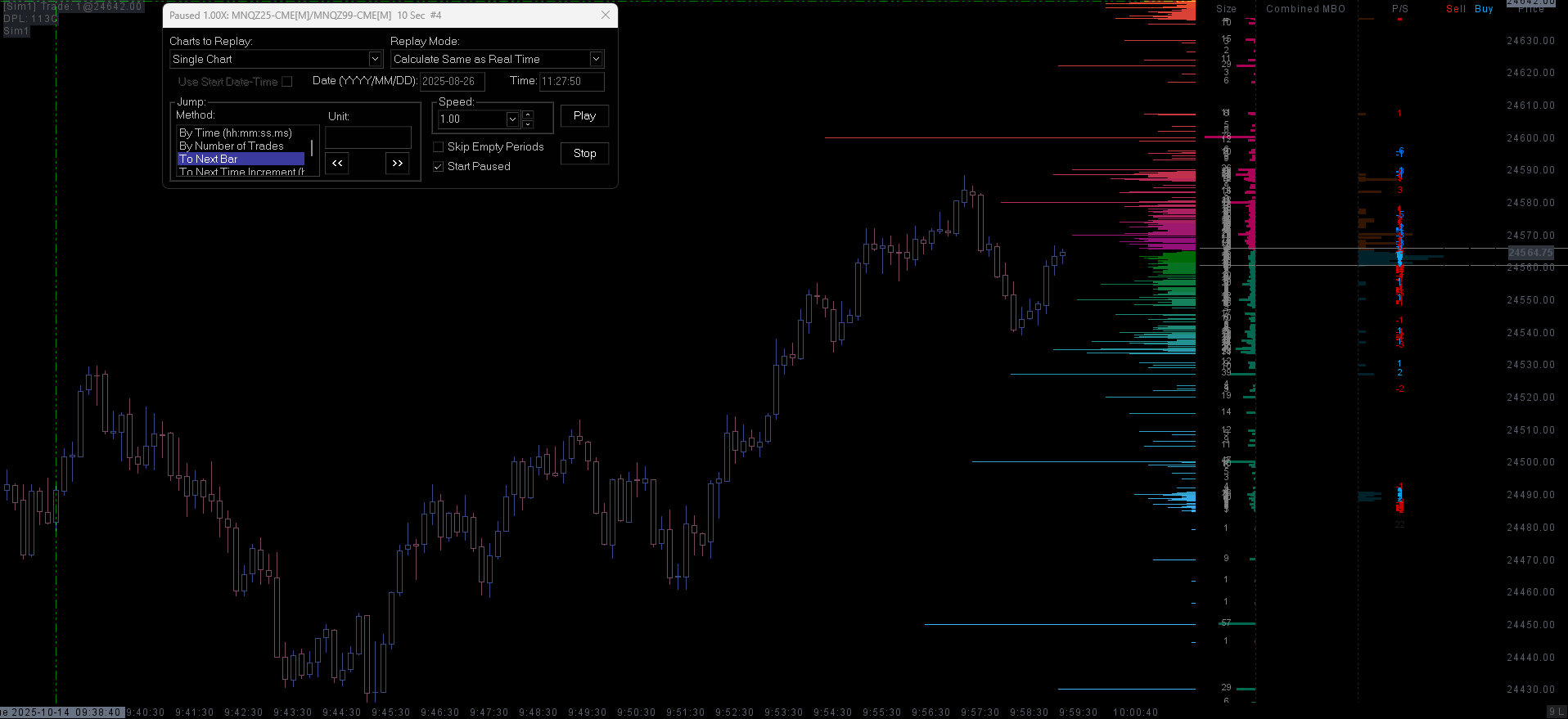 You have your chart setup with a primary symbol of "MNQZ25-CME" and a "Trade and Current Quote" symbol of "MNQZ99-CME". You most likely have the option for "Use as Trade Only Symbol" set to "No", in which case the system is trying to display the Market Depth information for MNQZ99-CME. Of course, there is no data for a symbol that old, which is why you are not seeing anything. During a replay, the DOM only shows the Market Depth information for the primary symbol, not the Trade and Current Quote symbol, which is why you are seeing the Market Depth data in this case. Set the option for "Use As Trade Only Symbol" to "Yes" and this will resolve your issue. Or remove the "Trade and Current Quote Symbol" - as we do not understand what you are trying to do using an old symbol like that. For the most reliable, advanced, and zero cost futures order routing, use the Teton service: Sierra Chart Teton Futures Order Routing |