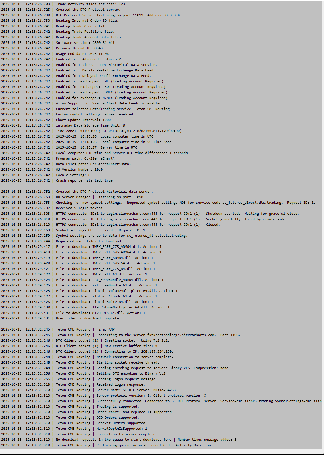 Issue Summary Sierra Chart logs indicate "DTC Protocol Server listening on port 11099" but external applications cannot connect to it. Connection attempts result in "Connection refused" errors despite the server appearing to be enabled and running. Environment Sierra Chart Version: 2800 64-bit License: Advanced Features 2 OS: Windows 10 Data Feed: Denali Real-Time Exchange Data Feed (working correctly) Trading Service: Teton CME Routing (connected and functioning) Configuration DTC Protocol Server Settings (confirmed via Server Settings UI): Enable DTC Protocol Server: Yes Listening Port: 11099 Listen IP Address: 0.0.0.0 (all addresses) DTC Protocol Server is Listening (Read Only): Yes ✅ Encoding: Binary with variable length strings Observed Behavior Sierra Chart Message Log Shows: 2025-10-15 12:04:53.254 | Created the DTC Protocol server. 2025-10-15 12:04:53.254 | DTC Protocol Server listening on port 11099. Address: 0.0.0.0 External Application (KAIROS Platform) Attempting Connection: 2025-10-15 09:07:08.307 | INFO | Connecting to DTC server 127.0.0.1:11099... 2025-10-15 09:07:10.310 | ERROR | DTC connection error: [Errno 10061] Connect call failed ('127.0.0.1', 11099) Error Code: 10061 = Windows WSAECONNREFUSED (Connection refused - nothing listening on port) Troubleshooting Steps Performed ✅ Verified Settings: Confirmed DTC Protocol Server enabled, port 11099, UI shows "Listening: Yes" ✅ Applied Settings Multiple Times: Clicked "Apply All" button, restarted Sierra Chart completely ✅ Port Change Test: Changed port from 11099 → 11100 → 11099 to force socket rebind ✅ Firewall Check: Windows Firewall not blocking (other Sierra Chart services working fine) ✅ Client Application: Using standard DTC protocol client (Python asyncio), tested with Binary VLS encoding, Protocol Version 8 ✅ Historical Data Port: Confirmed port 11098 (Historical Data Server) IS listening and accessible Evidence of Issue Sierra Chart's own internal client connections work: Teton CME Routing successfully connects using DTC Binary VLS to external server Historical Data Server (port 11098) is listening and accessible Message log shows proper DTC handshake when Sierra Chart acts as CLIENT External connections fail: Any attempt to connect TO Sierra Chart's DTC server on port 11099 is refused netstat shows no LISTENING socket on port 11099 Only SYN_SENT attempts from client visible (connection never established) Question for Support Why does Sierra Chart log "DTC Protocol Server listening on port 11099" but the TCP socket is not actually bound/listening, preventing external applications from connecting? Is there: A specific Windows permission required? An additional setting that must be enabled? A known issue with the DTC Protocol Server feature? A diagnostic log that shows why the server failed to bind to the port? Expected vs. Actual Expected: DTC Protocol Server binds to 0.0.0.0:11099 External applications can connect and perform DTC handshake (ENCODING_REQUEST → LOGON_REQUEST) Similar behavior to Historical Data Server (which works correctly on port 11098) Actual: Sierra Chart logs success message No TCP socket actually listening on port 11099 All connection attempts refused with WSAECONNREFUSED Thank you for your assistance. |