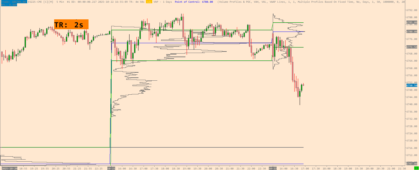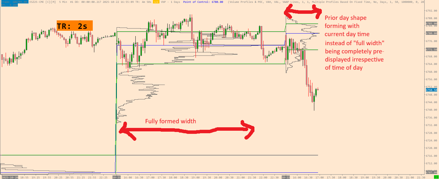 Hi John, The current day is displaying previous day's volume profile data; that is not the point of contention. The issue is about how the data is being shown. I have attached an image with highlights and notes called "John_image_Highlight.png" - comparing a finished day's display of prior day profile versus an ongoing session's display of prior day profile. Effectively, I am seeking a static displacement of fully formed prior day profile that is not dependent on current day's time to display its structure. |