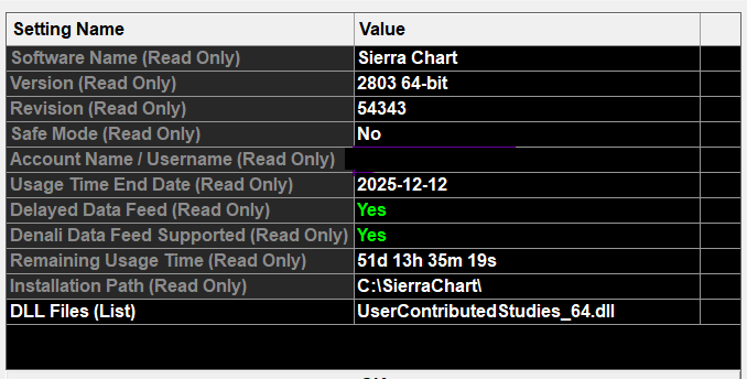 Help >> About does not show what package you have. You need to look at this on our website in the Account Control Panel for your account. You can access this by selecting "Help >> Account Control Panel" within your Sierra Chart software, or you can select the following link and login if needed: Simulated Futures Trading Service That being said, you are on Package 11, and per your Help >> About you have service through December 12, 2025. The issue with the Numbers Bars is that you are not trying to access it correctly. It is not a Bar Period type, it is a study. Refer to the instructions here (ignore the first line about needed to be on Package 5 - that is old and needs to be updated): Numbers Bars: Step-By-Step Instructions For the most reliable, advanced, and zero cost futures order routing, use the Teton service: Sierra Chart Teton Futures Order Routing Date Time Of Last Edit: 2025-10-22 18:38:54