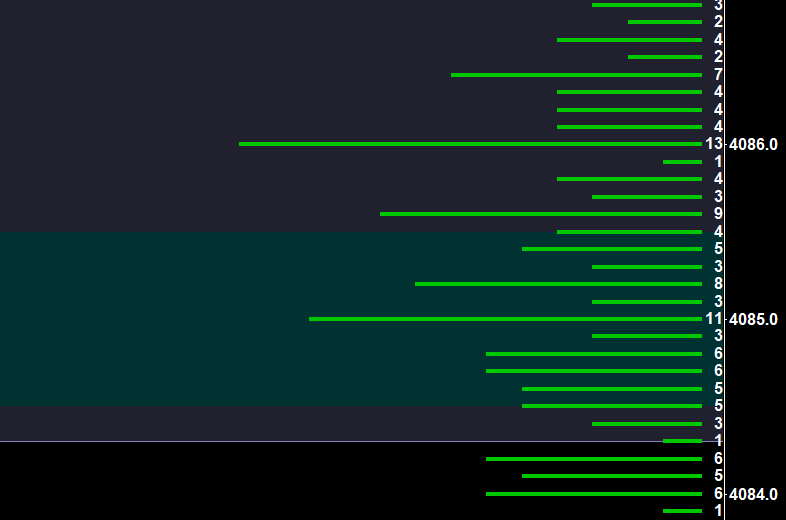 I have compressed my footprint chart by increasing the tick size to a multiple of the standard size. This seems to cause issues with the market depth historical graph highlighting. For example, I have set any volume above 10 to be highlighted. This works reliably for the normal tick size, but after increasing the tick size, it only works sometimes. In the attached screenshot, see how the combined price 4085 is highlighted due to the limit order with 11 volume, but the price 4086 is not highlighted despite there being a limit order with volume 13. I initially thought it somehow takes the average of all limit orders within the price increment, but that's not it. From my observation, it only highlights based on the last changed price, which is undesirable behaviour. E.g. if within the same price increment, a limit order changes from 9 to 10, it highlights the 10, but if another one changes to 9 afterwards (while the 10 remains unchanged), the highlight disappears. It should always highlight based on the highest volume within a price increment.