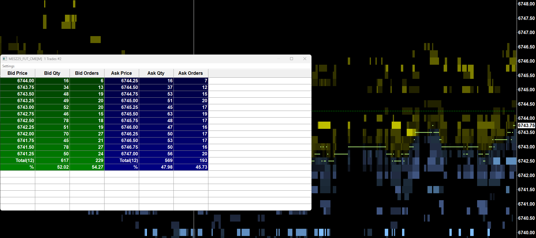 Hi SC Support, On MES with a 1-Tick chart, the Market Depth Historical Graph shows blank/gap areas across bars (no depth blocks). On some ticks nothing is drawn, while File → Open Market Depth Window shows all 12 bid/ask levels in real time with existing consistent sizes and volume (see screenshot). Setup: Version 2803, Feed Denali, Symbol MESZ25-CME, chart update in Milliseconds 20 Symbol Settings: Record Market Depth Data = Yes, Depth Levels = 12 Chart Settings → Market Depth: Max Depth Levels = 12, Combine Increment = 0 MDHG Inputs: Maximum Levels = 12, Combine Increment = 1, Minimum Volume Intensity Percent = 2% Question What exact configuration ensures a per-tick snapshot so all 12 levels are shown on every 1-Tick bar? If relevant, please advise on any required flags (download/record/timestamp), suffixes (e.g., -BID_ASK_TRADE_SYNC), or storage interval settings. Attachments: MDHG example with gaps; Market Depth Window (12 levels). Thanks in advance. |