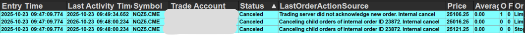 John, can you explain what happened here? (see screenshot) Placed a limit order where I wanted to get in, price ran through it, showed as not filled then proceeded through to my stop loss. Both orders showing as not filled, so I attempted to "flatten/cancel all orders' just in case something was lingering before closing out of the platform. As soon as I reopened SC, it showed me in the position with no stop loss, so I immediately flattened at a loss. Note that I'm not experiencing any connectivity issues and I'm using the settings "Use Server Side OCO Orders and Use Server Side Bracket Orders". Also, this is a prop trading account, luckily not Live. Any recommendations with regards to SC to avoid this happening again or is this solely a Rithmic/Prop issue? |