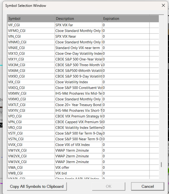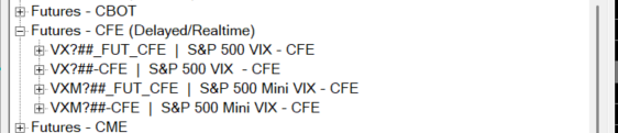 Please update to the latest release, as there have been changes to the list of symbols window that you get after you select the "Find Symbols" list. You can then search through the symbols in this case. Follow these instructions to update: Software Download: Fast Update The NASDAQ VIX Index symbol is VXN_CGI -- We only have data for the VIX Futures and Mini VIX Futues (what is listed). We do not have any futures data for othe CFE products. For the most reliable, advanced, and zero cost futures order routing, use the Teton service: Sierra Chart Teton Futures Order Routing |