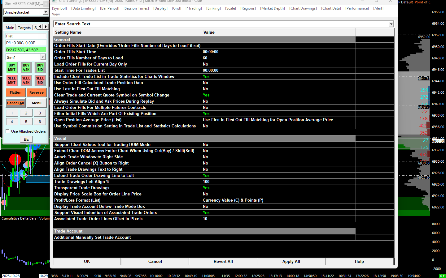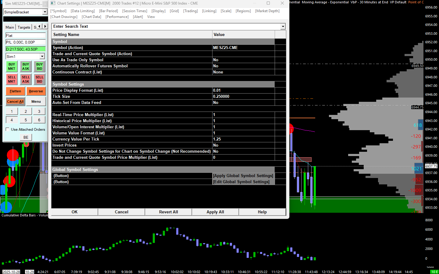 Please see the attached image. On the trade window, D:217.50C is correct. 43.50P is in ticks. All settings in Chart Settings are correct for this MES symbol. I would like to know how to show the correct point value for the profit instead of the tick value being shown. It also has a "P" suffix for some reason. I have read the documentation you provided. Please advise. https://www.sierrachart.com/image.php?Image=176175360316.png |