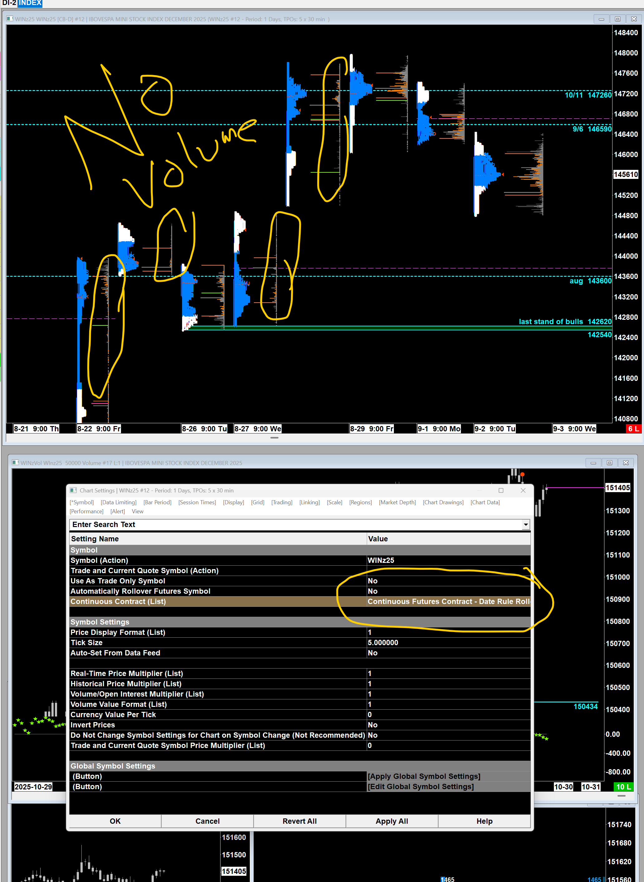 The "Continuous Futures" notation is showing as "[CB-D]" where the "D" stands for Disabled. There is something about this that the system does not like and therefore is not able to build the Continuous contract. Did you create special symbol settings for this? If so, then we would recommend disabling the option for "Global Settings >> Symbol Settings >> Use Custom Symbol Settings Values". After you select "OK" to close the Symbol Settings window select "File >> Reconnect", then see if the chart deals with the continuous contract properly. You may need to select "Edit >> Delete and Download Data" for that chart to get everything updated. Another possibility is that you are not getting the daily historical data for this symbol. If the above does not fix it, then try to open an historical (daily) chart for WINZ25 and see if you have that data. If not, then you will not be able to do a back-adjusted continuous contract, so you would be best served to use the perpetual contract anyway. For the most reliable, advanced, and zero cost futures order routing, use the Teton service: Sierra Chart Teton Futures Order Routing |