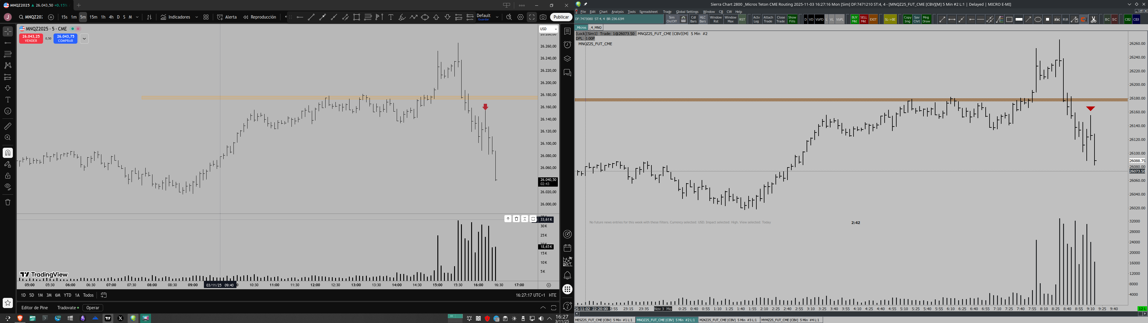 Hello, I am noticing a significant difference in data delay between Sierra Chart v2800 with Teton data (AMP Futures account) and the TradingView platform with Tradovate data from a funded account. The latter appears to be ahead of the "real" data from Sierra Chart, when in theory it should have real-time data and be very similar. I am attaching a screenshot of the charts comparing TradingView and SierraChart, marking a bar as a reference. |