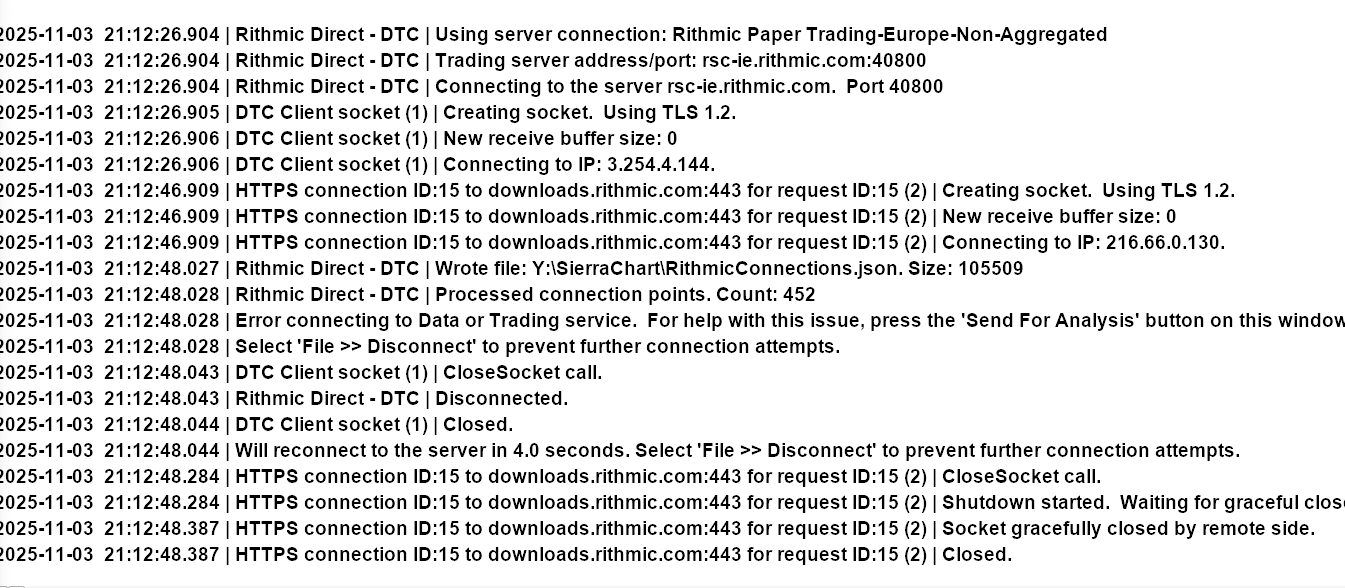 In terms of connectivity, you are trying to connect to Rithmic. Rithmic is known for having issues with their connectivity. You need to talk to them about this, as they own the software for the connection between Sierra Chart and Rithmic. The only thing we can suggest is to try a different server when you are having connectivity issues with Rithmic. -- With regards to the Numbers Bars, it doesn't look like you have the Numbers Bars study on that chart. Check to ensure that the study is added to that chart. If it is, then get that chart by following these instructions: Support Board Posting Information: Providing Chartbook with Only a Single Chart For the most reliable, advanced, and zero cost futures order routing, use the Teton service: Sierra Chart Teton Futures Order Routing |