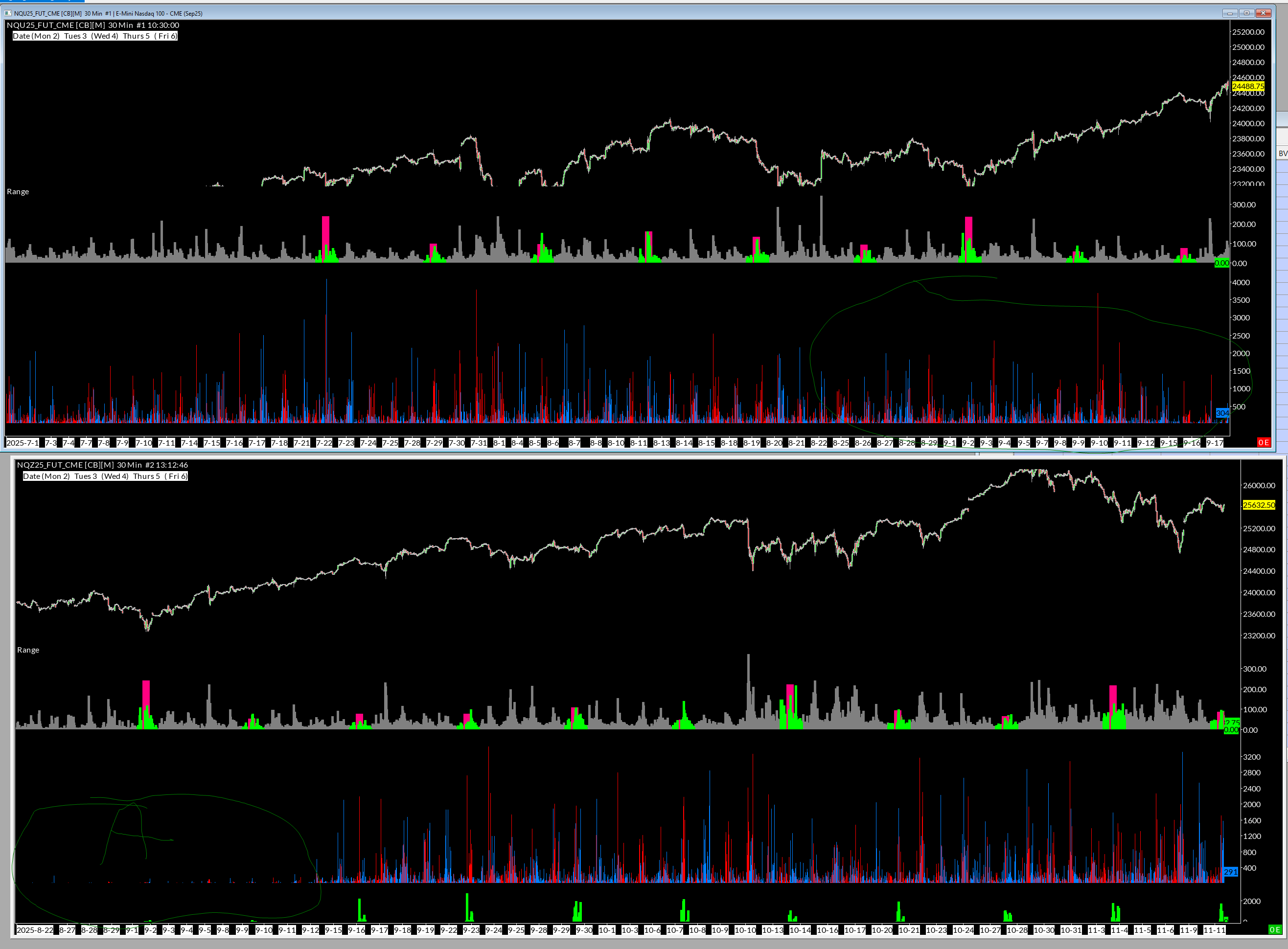 I used the spreadsheet formula if command to show the day of week and time of day for my stats it does work as you can see in picture the colors show up on that particular day and time. When it fails is the PREVIOUS period. Also the delta is completely wrong on continuous contracts for PREVIOUS contracts. Maybe the way I'm using spreadsheet formula to find and show ONLY day of week and time of day wasn't meant to work. Is there a correct way to put day of week and time of day range and delta into spreadsheet study so I can copy to Excel and create stats that give me an edge? As you can see in pic the weekday and time work fine UNTIL the previous contract is put on. Notice the 2 contract periods deltas don't match look at A there's almost no delta from 8/22 to 9/11 but on top chart on the NQU25 contract its just fine. There's no doubt doing a continuous contract does not show correct delta for previous contracts on the NQZ25 chart. |