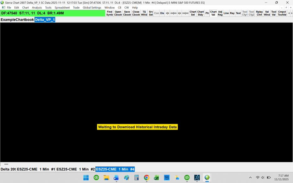 What are the following set to: - Chart >> Chart Settings >> Symbol >> Symbol: was set to ESu23_FUT_CME; changed it to ESz25_FUT_CME - Global Settings >> Data/Trade Service Settings >> Main Settings >> Current Selected Service: SC Data [data] - Global Settings >> Data/Trade Service Settings >> Common Settings >> Intraday Data Storage Time Unit: 1 Tick - Global Settings >> Data/Trade Service Settings >> Common Settings >> Maximum Historical Intraday Days to Download >> Non-Tick Data: 186 - Global Settings >> Data/Trade Service Settings >> Common Settings >> Maximum Historical Intraday Days to Download >> 1 Tick Data 186 |