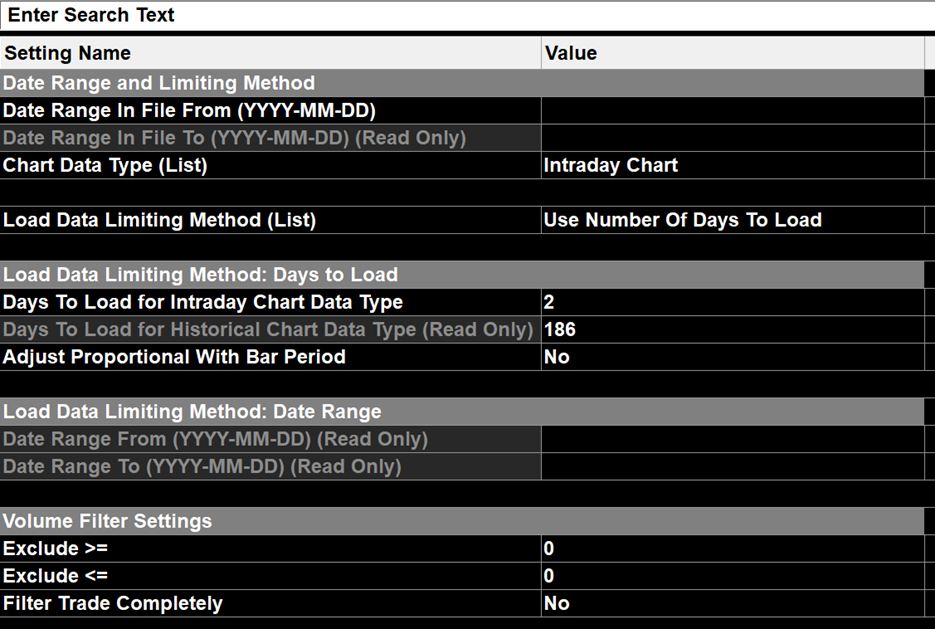 The chart itself is only trying to get 2 days of data. So this is not related to this chart. The reason the "Date Range in File From/To" is blank is because the system has not downloaded the data yet. So these values are not present. Also, you need to close that window and reopen it to get those fields to update. What are the following set to: - Chart >> Chart Settings >> Symbol >> Symbol - Global Settings >> Data/Trade Service Settings >> Main Settings >> Current Selected Service - Global Settings >> Data/Trade Service Settings >> Common Settings >> Intraday Data Storage Time Unit - Global Settings >> Data/Trade Service Settings >> Common Settings >> Maximum Historical Intraday Days to Download >> Non-Tick Data - Global Settings >> Data/Trade Service Settings >> Common Settings >> Maximum Historical Intraday Days to Download >> 1 Tick Data For the most reliable, advanced, and zero cost futures order routing, use the Teton service: Sierra Chart Teton Futures Order Routing |