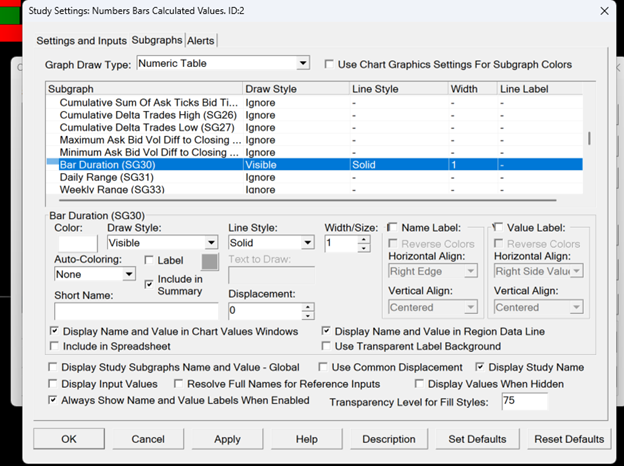 I intend to set an alert for the “Bar Duration” variable in the “Numbers Bars Calculated Values” study. Specifically, I would like to hear an alert sound when the value of the “Bar Duration” variable in the study for the closed candle is less than 3 seconds. To achieve this, I entered the condition SG30 < 3 in the Alerts tab. However, this condition does not produce the desired alert. My understanding is that Sierra Chart may be interpreting one second as a different numerical value. Could you please advise what adjustment I should make to the alert condition so that it functions as intended (i.e., triggers when the closed candle’s Bar Duration value in the Numbers Bars Calculated Values table is less than 3 seconds)? |
