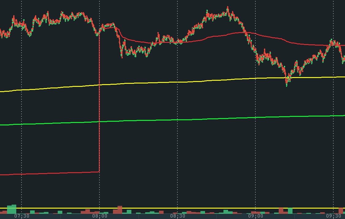 I would like to have a chart showing three VWAPs that automatically refresh at the same time every day. As an example, I've included a screenshot from another program that refreshed at 8:00 AM (red line). The green and yellow lines represent VWAPs that started the previous day and haven't refreshed yet. Ideally, this would be presented in a clear graphical format (not like the screenshot in the first post). Is this possible? |