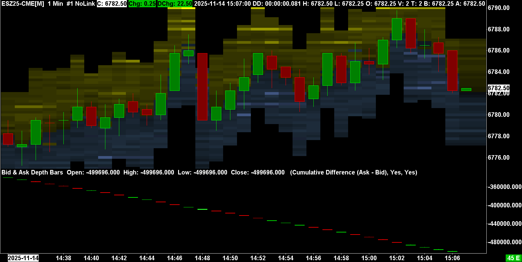First, these images are too complicated. We cannot help with this, with so much complexity being presented to us. All studies must be removed from the chart, other than the study in question. You can duplicate the chart, and then clean up that duplicated chart as explained here: Support Board Posting Information: Attaching or Posting a Screenshot/Image (Optional) All of your chart images are rejected at this point. And all 6 images you provided, in those last screenshots, none of them show the Bid and Ask Depth Bars study. Or we do not know what is what. And also the images are very large for us because we are using a lower resolution but that is all right. Update Sierra Chart to the current version: Software Download: Fast Update This is essential/mandatory . Otherwise, we cannot help. The Bid and Ask Depth Bars study relies on market depth data. So therefore you need to use the Market Depth Historical Graph to be sure you actually have the market depth data: Market Depth Historical Graph: Market Depth Historical Graph Not Displaying So you need to be sure you actually have market depth data, in the areas of the chart where you are looking at the Bid and Ask Depth Bars study. The issue must relate to historical market depth data. Bid and Ask Depth Bars is 100% stable in the way it is designed. Sierra Chart Support - Engineering Level Your definitive source for support. Other responses are from users. Try to keep your questions brief and to the point. Be aware of support policy: https://www.sierrachart.com/index.php?l=PostingInformation.php#GeneralInformation For the most reliable, advanced, and zero cost futures order routing, use the Teton service: Sierra Chart Teton Futures Order Routing Date Time Of Last Edit: 2025-11-14 18:22:35