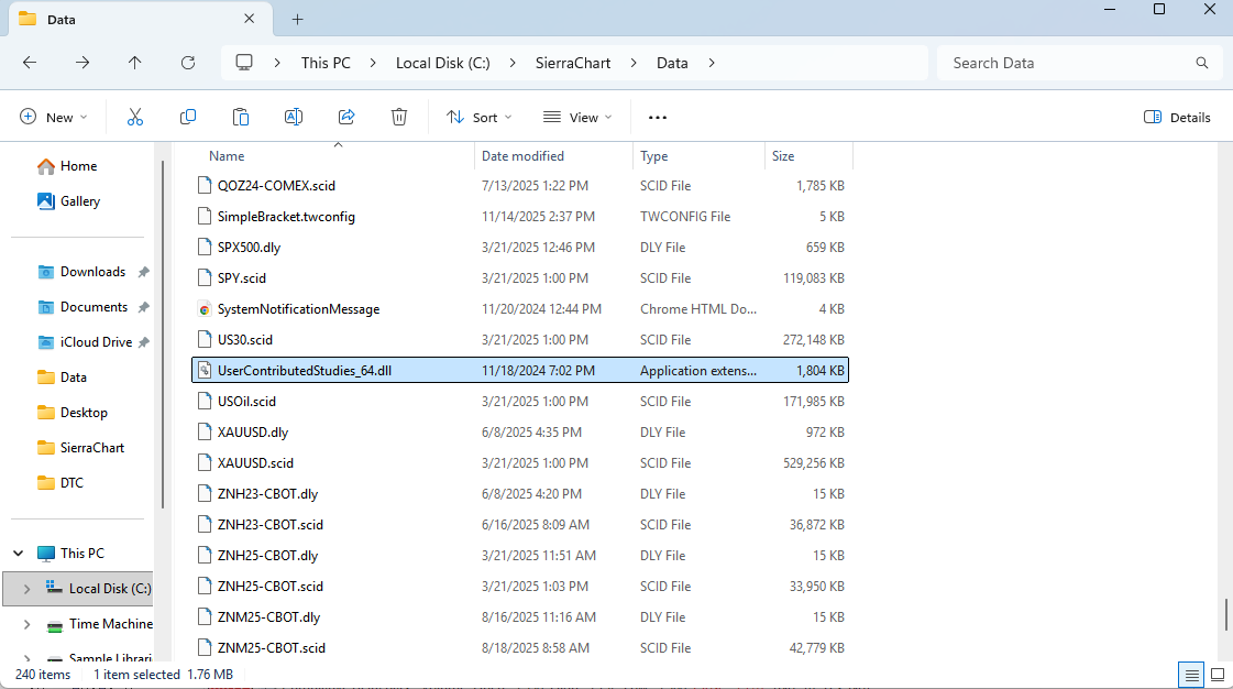 I reinstalled the latest version of Sierra Chart as per the instructions, and I located the UserContributedStudies.dll file in the Data folder (see screenshot). It's the only DLL file in the Data folder. Unfortunately the two specific studies are still missing. Just to clarify, most of the custom studies on my chartbook are still there, it's just two that are missing