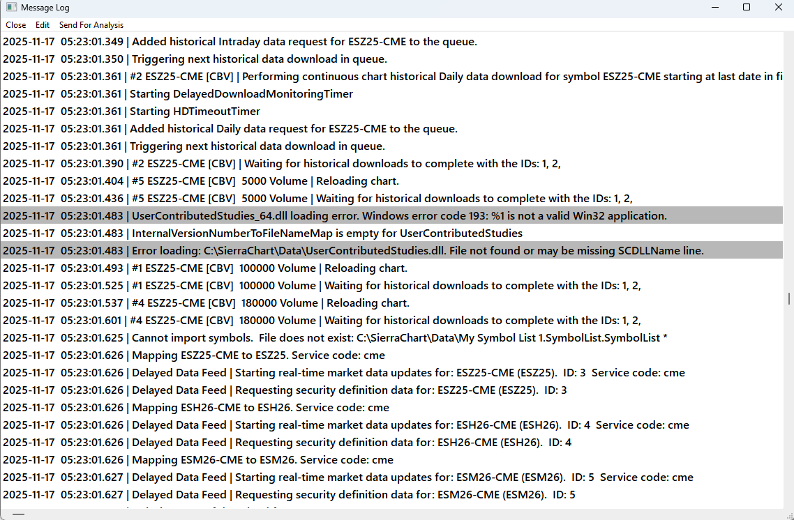 The highlighted lines in the message log (attached) are the only mention of the DLL files. I want to restate that on Friday morning I opened my chartbook and everything was normal. I decided to update (through help menu) before I started trading, and since then these studies have been missing. The custom studies are from a third party. I downloaded them again from the source and replaced them in the Data folder, but the same issue persists. I will contact the chart creator and see if I can find a solution |
