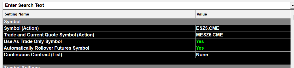 You can do this by using this setting in the ES chart: Chart Settings: Trade and Current Quote Symbol (text box) (Chart >> Chart Settings >> Symbol >> Symbol menu) Set to the MES symbol. The Trade Window for that chart will be for MES. Sierra Chart Support - Engineering Level Your definitive source for support. Other responses are from users. Try to keep your questions brief and to the point. Be aware of support policy: https://www.sierrachart.com/index.php?l=PostingInformation.php#GeneralInformation For the most reliable, advanced, and zero cost futures order routing, use the Teton service: Sierra Chart Teton Futures Order Routing Date Time Of Last Edit: 2025-11-17 15:59:19