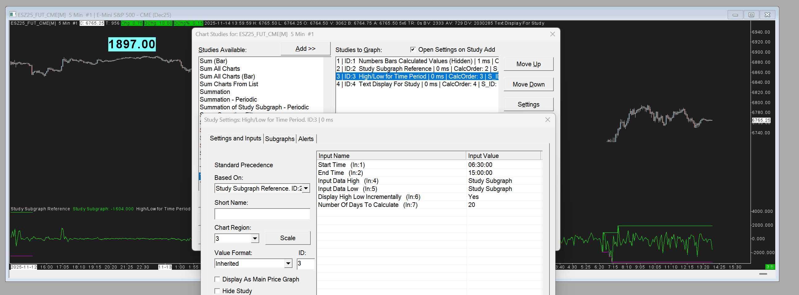 I'm using the study "Number Bars calculated Values" and enabled Cumulative Day delta (AskV - BidV) that shows in my chart region 2 for each candle. And I've also set Reset condition to true so that at 6pm EST, this CD starts a fresh. My requirement is to always display the largest CD value hit for that day somewhere on the top right corner of my footprint chart. And it keeps on changing during that day when a bigger CD value hits during the day. For ex: market opens at 9:30am EST, 14th Nov and the largest CD value hit so far since 6pm EST, 13th Nov is -4500. So this value to be continuously displayed in my chart until even a bigger delta value hits. Suppose, if CD value hits -5000 at 11am, then -5000 starts getting displayed instead of -4500 can you help me with how to configure this? |