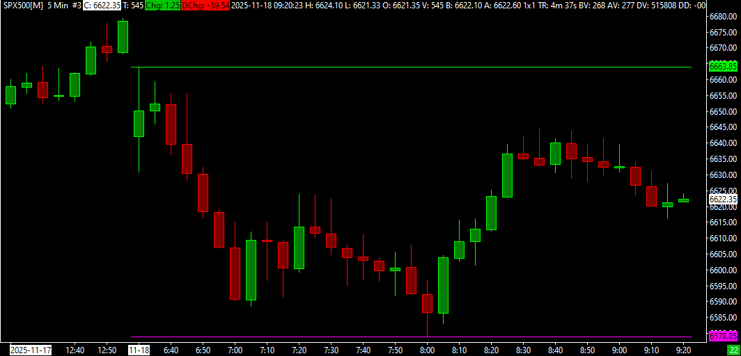 My current SPX data is off by about 5pts, meaning the open, high, low and current price displayed on a chart are 5pts higher than they actually are. I'm not exactly sure why this would happen, I assume the issue is based off the data feed, but I believe I'm using the Denali Exchange Data. I have SP11. I thought at first having delayed equity data would cause the SPX calculation to be off but would not explain the discrepancy in price. The ticker I'm using is SPX500. The other recommended SPX ticker (SPX_CGI) does not load a chart. Steps taken: - deleted + downloaded data from chart - disconnected + reconnected to data feed I posted a chart below with the only study being the high + low of today's session (11/18) as a reference point. Times are PST. https://www.sierrachart.com/image.php?Image=1763486424393.png Date Time Of Last Edit: 2025-11-18 17:34:34