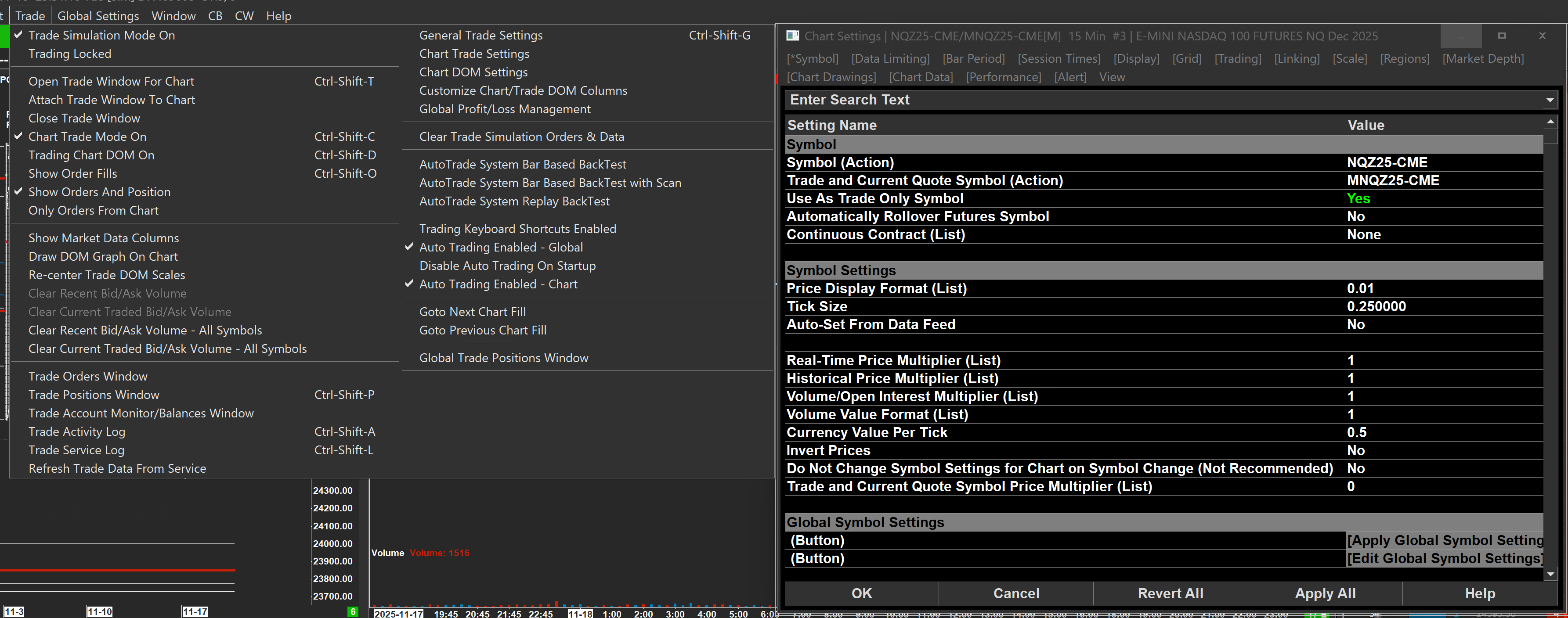 I'm experiencing an issue with sc.GetTradePosition() returning incorrect position data when using Trade Simulation Mode with symbol mapping (charting one symbol while trading another). Setup: - Trade Simulation Mode: ON (not using Trade Evaluator) - Chart Symbol: NQZ25-CME/MNQZ25-CME[M] (charting NQ, trading MNQ) - Trades are correctly being placed on [Sim]MNQZ25-CME as shown in Trade Activity Log - Study using sc.SendOrdersToTradeService = !sc.GlobalTradeSimulationIsOn; s_SCPositionData PositionData; int result = sc.GetTradePosition(PositionData); if (PositionData.PositionQuantity == 0) { sc.AddMessageToLog("No open position. Cannot add TP/SL.", 1); sc.MenuEventID = 0; return; } SCString positionInfo; positionInfo.Format("Position Details: Quantity=%d, OpenPL=%.2f, DailyPL=%.2f, AverageFillPrice=%.2f", PositionData.PositionQuantity, PositionData.OpenProfitLoss, PositionData.DailyProfitLoss, PositionData.AveragePrice); sc.AddMessageToLog(positionInfo, 0); Actual Output: 2025-11-18 21:07:39.522 | Chart: NQZ25-CME/MNQZ25-CME[M] 5 Min #5 | Study: Smart Trade Manager | Position Details: Quantity=0, OpenPL=-103.50, DailyPL=442.20, AverageFillPrice=24675.00 Problem: PositionQuantity returns 0 despite having an active simulated position. However, other fields like OpenPL, DailyPL, and AverageFillPrice show correct data, indicating there IS a position AND i can clearly see the position open in the chart visually. The Trade Activity Log confirms trades are filling on [Sim]MNQZ25-CME, but sc.GetTradePosition() called from a chart with symbol NQZ25-CME/MNQZ25-CME[M] is not retrieving the position quantity. Attempted Solutions: 1. Used sc.GetTradePositionForSymbolAndAccount() with [Sim]MNQZ25-CME - still returns Quantity=0 2. Used sc.GetTradeSymbol() to get the trading symbol - correctly returns MNQZ25-CME, but querying [Sim]MNQZ25-CME or MNQZ25-CME both returns Quantity=0 Documentation Reference: According to https://www.sierrachart.com/index.php?page=doc/ACSILTrading.html#scGetTradePosition: "For simulated Trade Positions data, the data comes from the internal Trades list of a chart." Questions: 1. Is this expected behavior when charting one symbol but trading another in simulation mode? 2. How should sc.GetTradePosition() or sc.GetTradePositionForSymbolAndAccount() (the latter one probably doesn't even work in sim mode because we don't have an account?) be used to retrieve simulated position data when the chart symbol differs from the trading symbol? 3. Why does PositionQuantity return 0 while other position fields (OpenPL, AverageFillPrice) contain valid data? Is there a different approach needed for accessing simulated position data with symbol mapping, or is this a potential bug? Semi-Related, but same problem: Position quantity with GetTradePosition is 0 on Teton Order Routing It seems like the position quantity is broken in simulation mode. I can't switch to the trading evaluator service at the moment, because i am still relying on delayed EUREX data and your docs are saying this won't work. Thank you for your assistance. |