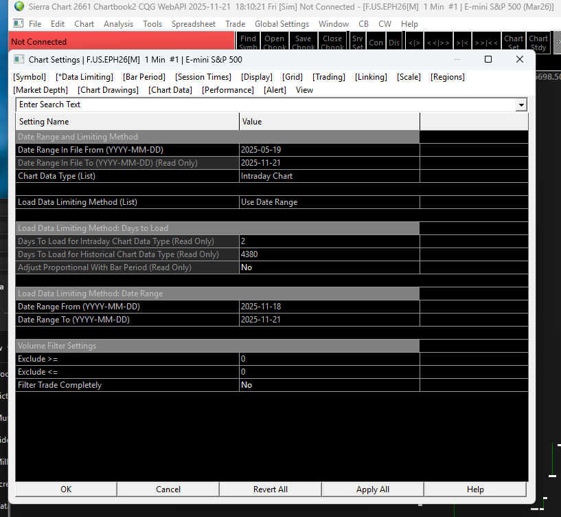 I am trying to filter the amount of days exporting into my text file. I have already change days to load to 2 and changed the date range and limiting method, when i change the 'Date range in File From' it automatically goes back to the original date once i hit enter which is preventing me from changing it and continuing to export a huge amount of excess days. I've changed my 'Load Data Limiting Method' to 'Use Date Range' and changed 'Load Data Limiting Method: Date Range' to correct days. I've tried exporting bar data which is not necessarily what i need but it still didn't work. I Also deleted, reloaded and recalculated the data after all changes... What could be the issue, I'll leave a reference screenshot below to show my changes.