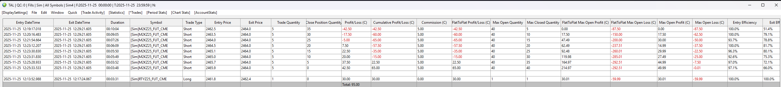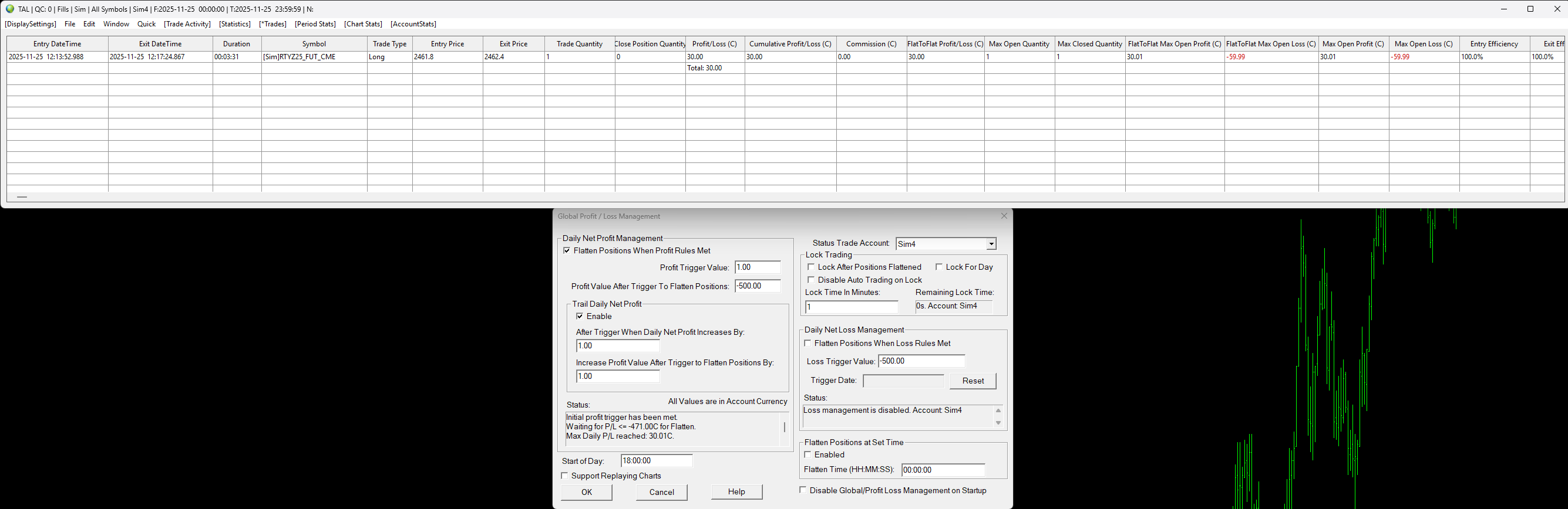 Let's put aside my issue above, there's more to that and I'm trying to nail that down because if I open a fresh chartbook, open a new DOM and do a single trade then it calculates correctly. So its not a settings issue but I need to do more testing to give you something clean to look at. However there's definitely something funky going on here and I think there might be different issues at play at the same time. I created a new sim account (SIM4), made a trade in RTY and then M2K (micro RTY). You can see from the 2 images that the trail PnL on Global Profit/Loss after the first trade looks correct, but after the second its showing $65 which doesn't make sense to me. The second trade I had to add to so I could get a profitable trade but all exits happened at the same time. I'll post the non flat-to-flat display next. Thanks. |