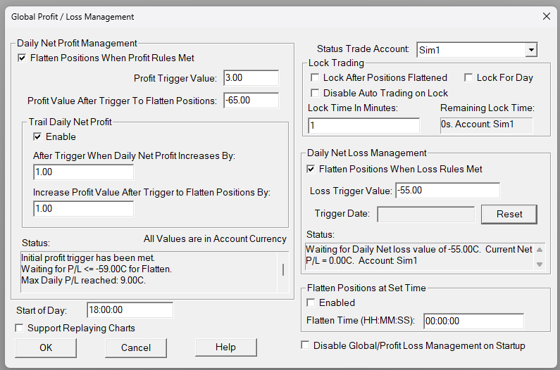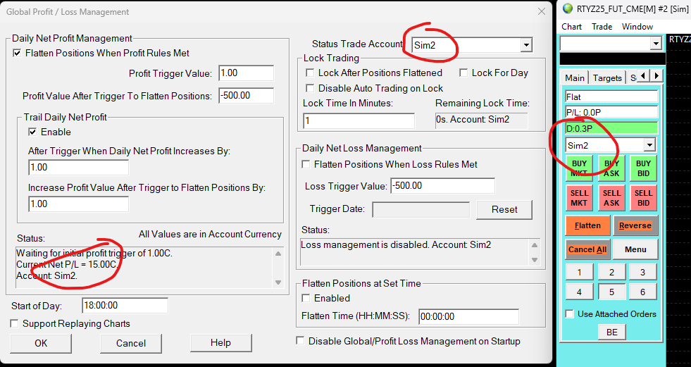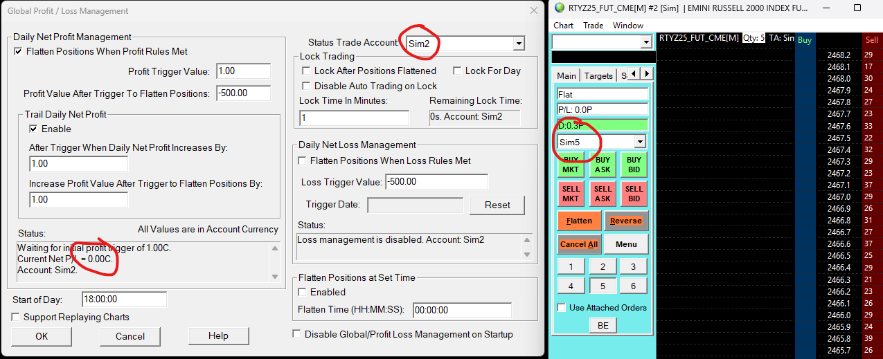 ...and with these two images: When I set the DOM to be Sim2 it shows PnL in the Global Profit/Loss to be $15. But if I change only the DOM to Sim5, the value in Global Profit/Loss changes $0 even though Global is still showing Sim2. I don't see why that should change. The $0 doesn't even apply to Sim5, so its not like its showing Sim5 but not updating a display. |