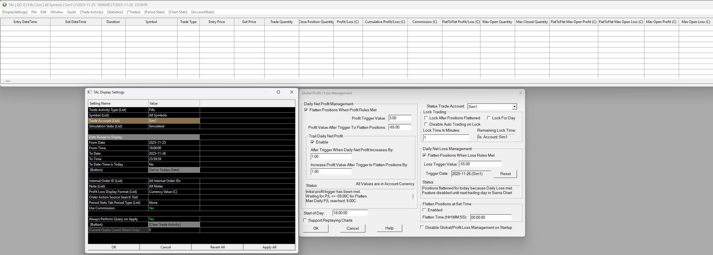 You have your "Start of Day" set to "18:00" on the "Global Profit/Loss Management". Please change the date and time for the start of your Trade Activity Log to start from yesterday at 18:00. We want to ensure there were no other trades that occurred.
