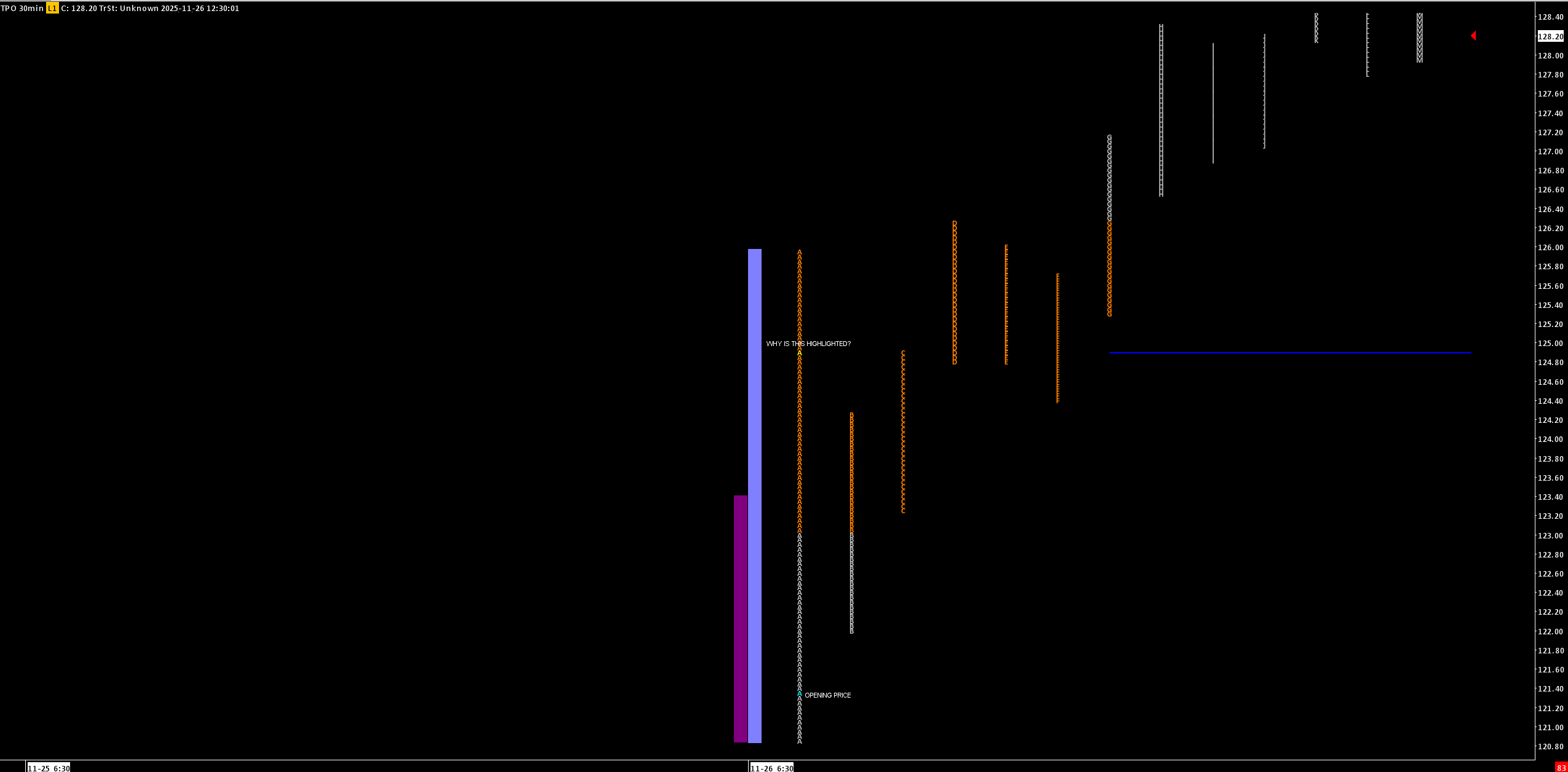 Hey Team, I noticed that for the TPO profile of the last trading day, if you look at the first period (A period), there are two separate letters that are highlighted. I have enabled only highlighting the opening price (colored blue in the screenshot). You will notice that there is another price/letter that is highlighted as well (in yellow), which does not make sense. This is for the symbol "HOOD" , last trading day (11/26). |