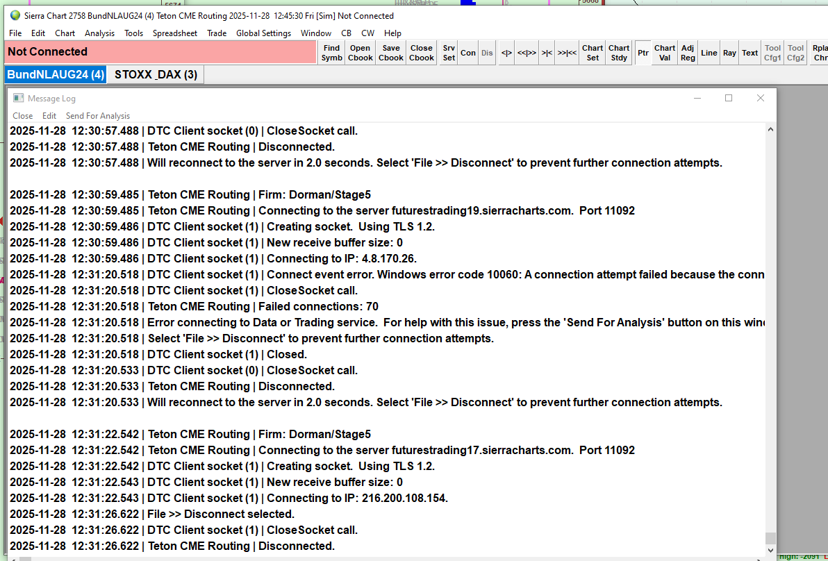 You should be able to connect to Sierra Chart now. If not update Sierra Chart to the latest version: Software Download: Fast Update Sierra Chart Support - Engineering Level Your definitive source for support. Other responses are from users. Try to keep your questions brief and to the point. Be aware of support policy: https://www.sierrachart.com/index.php?l=PostingInformation.php#GeneralInformation For the most reliable, advanced, and zero cost futures order routing, use the Teton service: Sierra Chart Teton Futures Order Routing |
