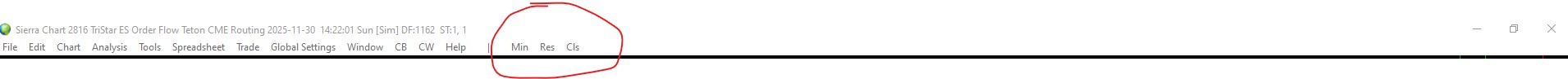 We need to prepare documentation for how to configure those commands. The settings are in Global Settings >> General Settings >> GUI >> Multiple Document Interface (MDI) and Custom Title Bar Settings. You can configure, the menu command names and also the separator. Child window controls are implemented as menu commands. Sierra Chart Support - Engineering Level Your definitive source for support. Other responses are from users. Try to keep your questions brief and to the point. Be aware of support policy: https://www.sierrachart.com/index.php?l=PostingInformation.php#GeneralInformation For the most reliable, advanced, and zero cost futures order routing, use the Teton service: Sierra Chart Teton Futures Order Routing |