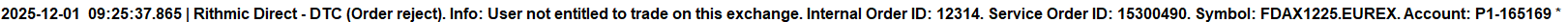 The error comes from Rithmic and states you are not setup for that symbol. You need to talk to your prop firm about this. We would be surprised if they allow trading EUREX at all.