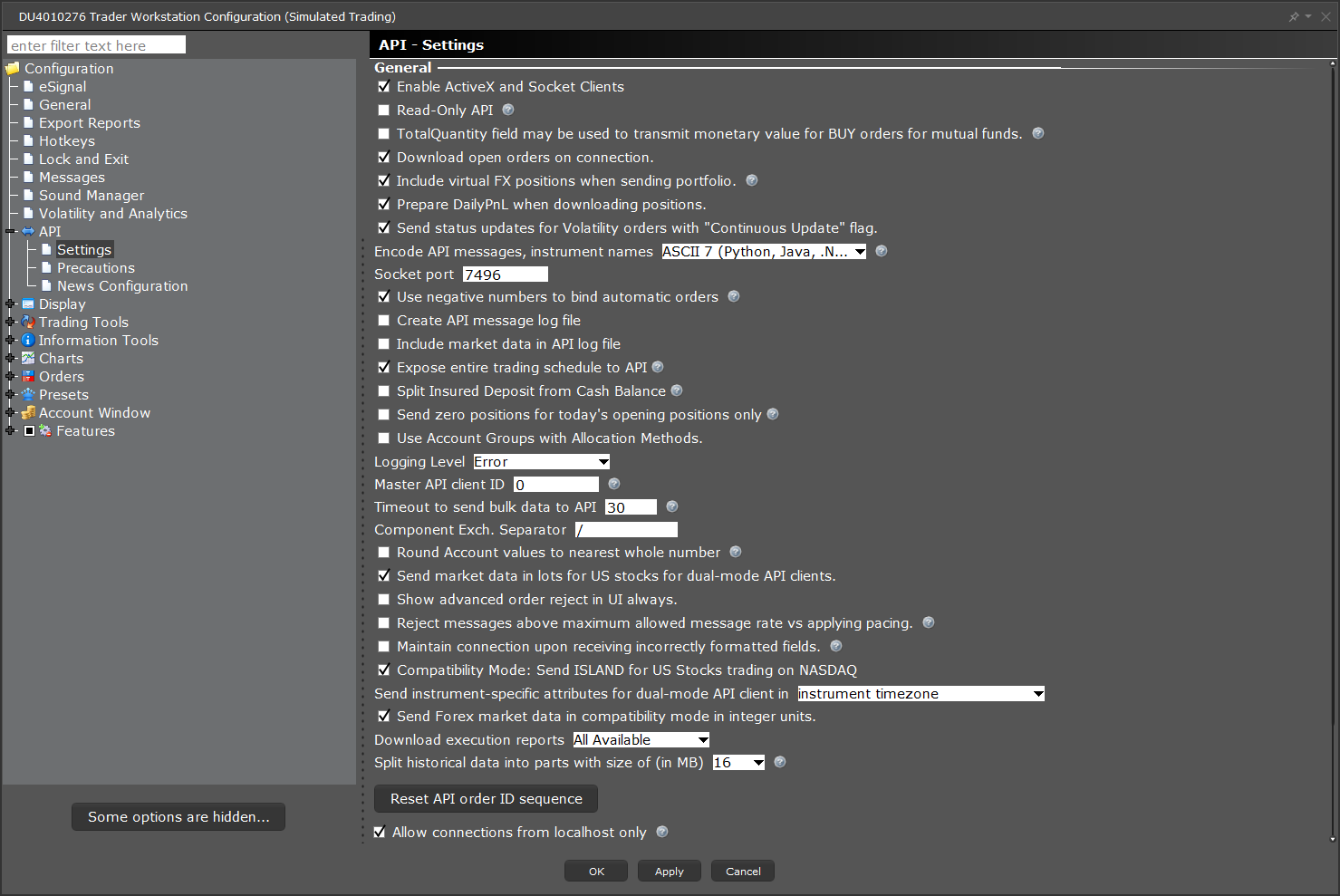 Hi All, First day on SC. I am trying to trade my Interactive Brokers account from SC. I have Pack 11, Denali Feed US & Total View. Setup as per the guide. Interactive Brokers Trading Service I am on TWS Desktop trying to Trade SPY. The symbol i want to use in SC is SPY_MBO. When i try to trade SPY_MBO i get this message: 2025-12-01 12:05:14.802 | Symbol Error | (unknown symbol with ID 2612) is unknown, unavailable, or improperly formatted. No security definition has been found for the request 2025-12-01 12:06:23.704 | Trading server did not acknowledge new order | Symbol: SPY_MBO | TradeAccount: DUxx | InternalOrderID: 6474 | ServiceOrderID: 2614 | Current Status: Order Sent * If i switch the chart in SC to SPY, i get this error. 2025-12-01 12:06:40.417 | Symbol Error | (unknown symbol with ID 2629) is unknown, unavailable, or improperly formatted. The contract description specified for SPY is ambiguous; you must specify the currency. 2025-12-01 12:06:56.662 | Trading server did not acknowledge new order | Symbol: SPY | TradeAccount: DUxx | InternalOrderID: 6489 | ServiceOrderID: 2629 | Current Status: Order Sent * Please help with how to map SPY_MBO to SPY in TWS. I suspect i have missed a step somewhere. Thanks in advance. |