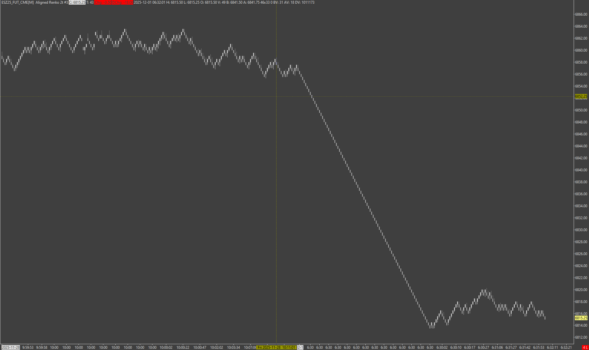 Why did this happen and how do I fix this chart. The OHLC for the first minute of today's trading session is 6813.50, 6820.25, 6813.50, 6818.25. Yet this Renko chart has the open at 6856.50 All other charts as far as I can see are correct. This is a Renko 2T chart for the ES. ESZ25. Date Time Of Last Edit: 2025-12-01 19:25:06