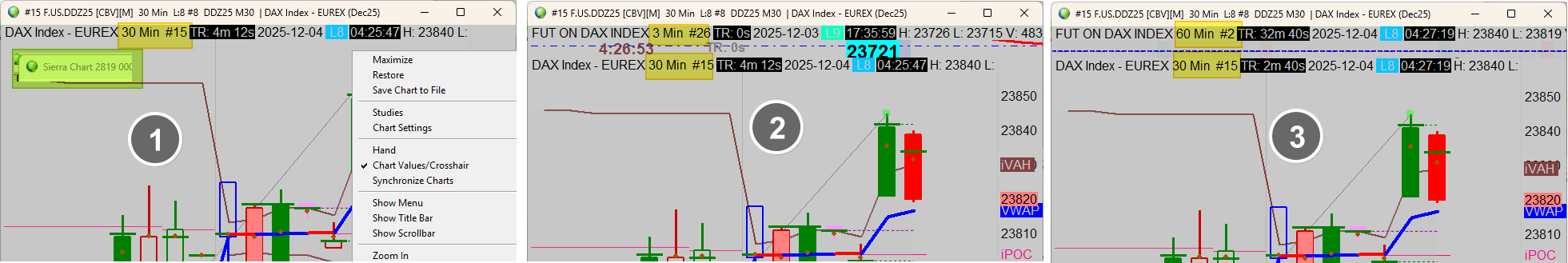 In the “detached” windows, neither “TitleBar” nor “ScrollBar,” nor "Menu" are enabled for me. The pic shows version 2819. The “TitleBar” is now permanently enabled, even though I did not enable it. (#1) For #2 and #3, I deliberately enabled the “TitleBar.” The chart is now displaying strange behavior. A different chart is displayed in the “background” which also changes. I am back to 2813. |