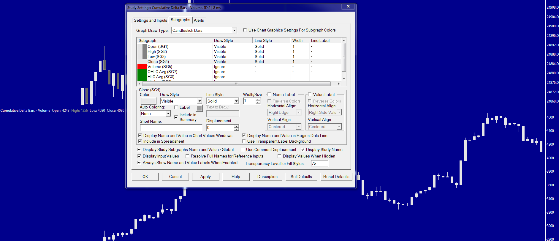 To change the colors of the "Cumulative Delta Bars" you need to adjust the subgraph colors for the "Open/High/Low/Close" subgraphs. Refer to the following: Color Settings for Graph Draw Types: Candlestick Note that there is an option at the top of the Subgraphs Tab for "Use Chart Graphics Settings for Subgraph Colors". This will need to be unchecked to change the colors, but it is unchecked by default. Refer to the following: Chart Studies: Subgraphs Tab >> Use Chart Graphics Settings for Subgraph Colors For the most reliable, advanced, and zero cost futures order routing, use the Teton service: Sierra Chart Teton Futures Order Routing |