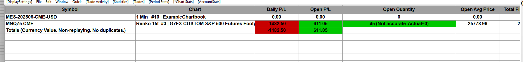 Follow the instructions here: Trade Activity Log: Solving Inaccurate Trade Statistics for Charts Field Values Sierra Chart Support - Engineering Level Your definitive source for support. Other responses are from users. Try to keep your questions brief and to the point. Be aware of support policy: https://www.sierrachart.com/index.php?l=PostingInformation.php#GeneralInformation For the most reliable, advanced, and zero cost futures order routing, use the Teton service: Sierra Chart Teton Futures Order Routing |
