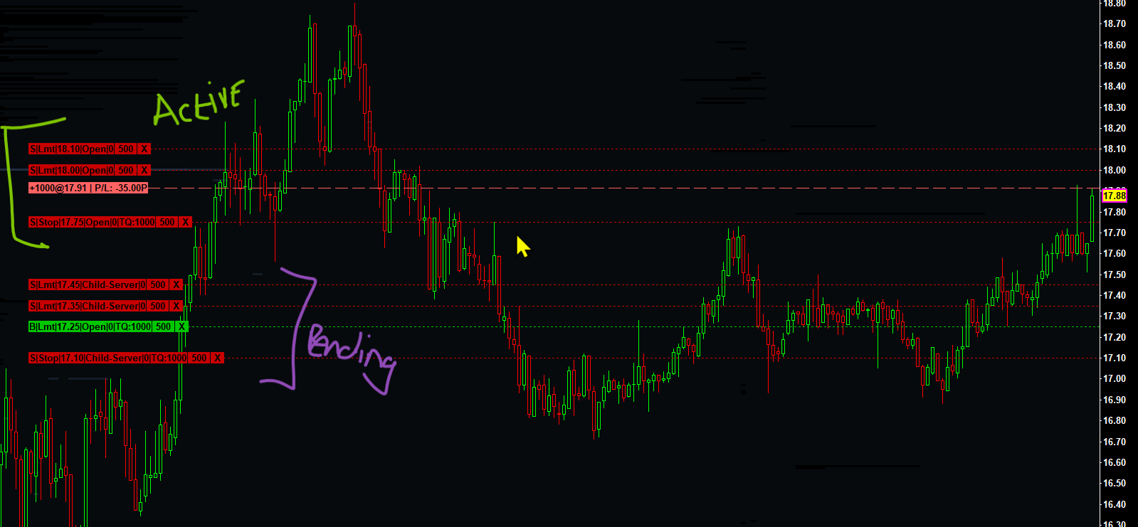 Hi SC'ers, I have modified the Chart Trading Order Lines to my preference via Graphics Settings - Global -> Colors & Widths -> "Chart Trading Order Line ?X?X?X" Im looking for a way to differentiate these order lines between orders that are active & filled vs orders which are pending. The use case for this, is for when scalping and i have 3 entries, and those entries both have two brackets. The chart becomes chaotic. At present, they look exactly the same, having inherited the colour scheme from above mentioned location. Image example attached. Thanks in advance |