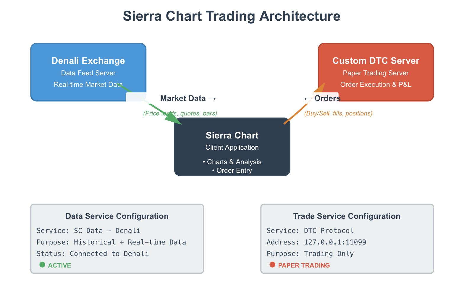 We do not have any sample code. So you want to create a DTC Protocol Server that Sierra Chart will connect to, to receive the trading orders? And then within Sierra Chart connected to that server you also want to use the Denali Exchange Data Feed for market data? This is supported. Sierra Chart Support - Engineering Level Your definitive source for support. Other responses are from users. Try to keep your questions brief and to the point. Be aware of support policy: https://www.sierrachart.com/index.php?l=PostingInformation.php#GeneralInformation For the most reliable, advanced, and zero cost futures order routing, use the Teton service: Sierra Chart Teton Futures Order Routing Date Time Of Last Edit: 2025-12-09 16:06:32