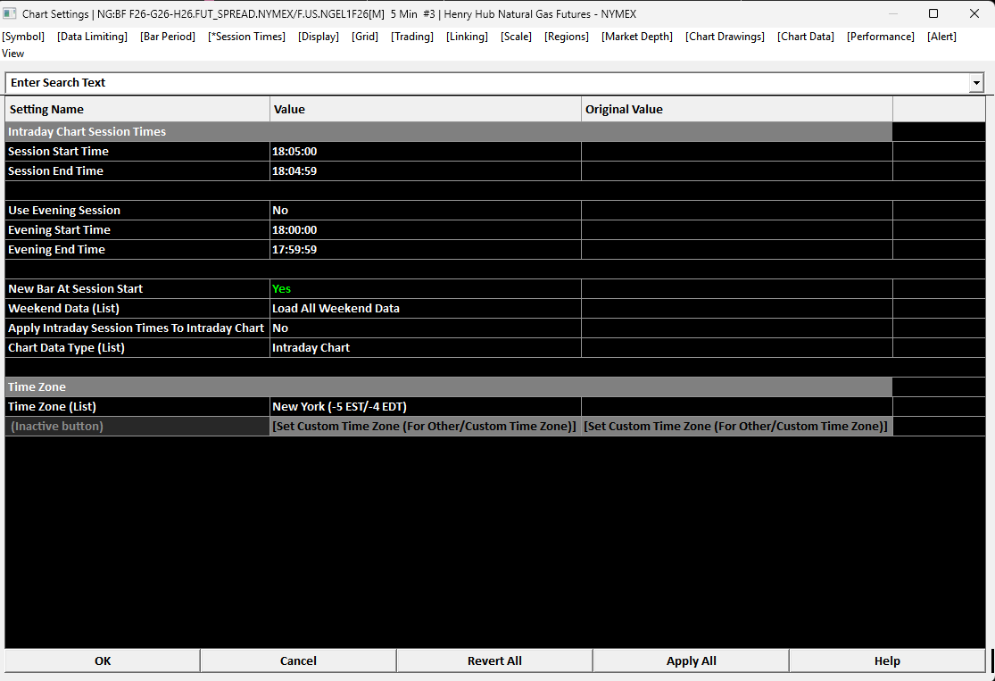 Hi, I see NG: BF F26-G26-H26 data missing 5:00 pm EST onwards. Attached session times and bar period from chart settings. Please let me know what all I need to do to get this fixed. Cyrus |