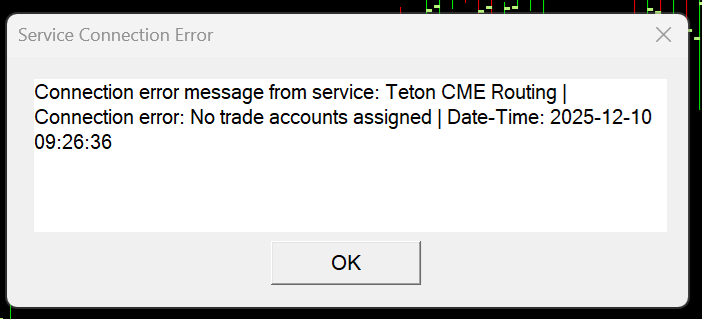 We found the problem!. The firm is not set: 2025-12-10 19:19:43.006 | Teton CME Routing | Firm: Follow steps 7 through 10 here: Sierra Chart Teton Futures Order Routing: Setup Instructions In your case it needs to be AMP Sierra Chart Support - Engineering Level Your definitive source for support. Other responses are from users. Try to keep your questions brief and to the point. Be aware of support policy: https://www.sierrachart.com/index.php?l=PostingInformation.php#GeneralInformation For the most reliable, advanced, and zero cost futures order routing, use the Teton service: Sierra Chart Teton Futures Order Routing Date Time Of Last Edit: 2025-12-10 20:54:31