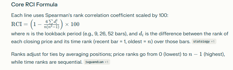 From AI... Spearman's RCI (Rank Correlation Index) ribbon on TradingView plots three lines, each representing the RCI calculated over different periods (typically short, medium, and long, like 9, 26, or 52), measuring the correlation between price ranks and time sequence ranks. RCI Calculation The core formula for RCI adapts Spearman's rank correlation coefficient to trading data: RCI=(1−6∑d2n(n2−1))×100RCI=(1−n(n2−1)6∑d2)×100 (See attached) where n is the lookback period, and d is the difference between the rank of the current closing price and the rank of its position in time (1 to n, with 1 being the most recent bar). To compute: • Rank closing prices over n bars (highest price gets rank 1, lowest gets rank n). • Rank time positions (most recent bar is 1, oldest is n). • Calculate d for each bar, square and sum them, then apply the formula. Ribbon Implementation TradingView's version overlays three RCI lines in one pane for visual trend alignment: values above +80 signal overbought/uptrends, below -80 indicate oversold/downtrends, and ribbon convergence/divergence highlights momentum shifts. |