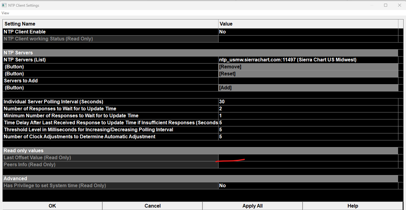 In your case NTP is not going to work because Sierra Chart does not have the privilege to change the clock. To solve this, refer to: Network Time Protocol Client: Operating System Privileges for Setting Time Sierra Chart Support - Engineering Level Your definitive source for support. Other responses are from users. Try to keep your questions brief and to the point. Be aware of support policy: https://www.sierrachart.com/index.php?l=PostingInformation.php#GeneralInformation For the most reliable, advanced, and zero cost futures order routing, use the Teton service: Sierra Chart Teton Futures Order Routing |