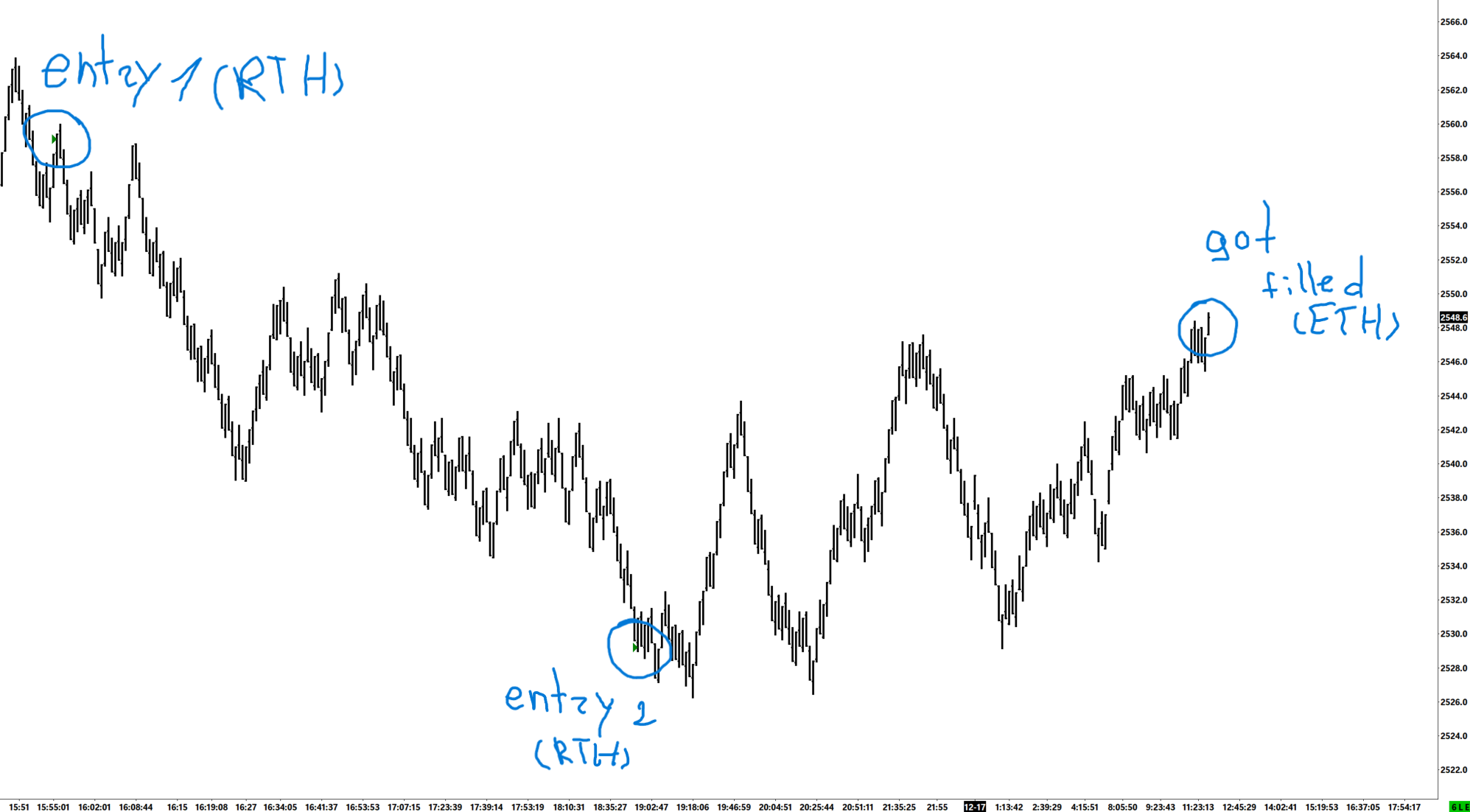 ETH trade fills executed but not displayed on chart (no exit markers or trade lines)
