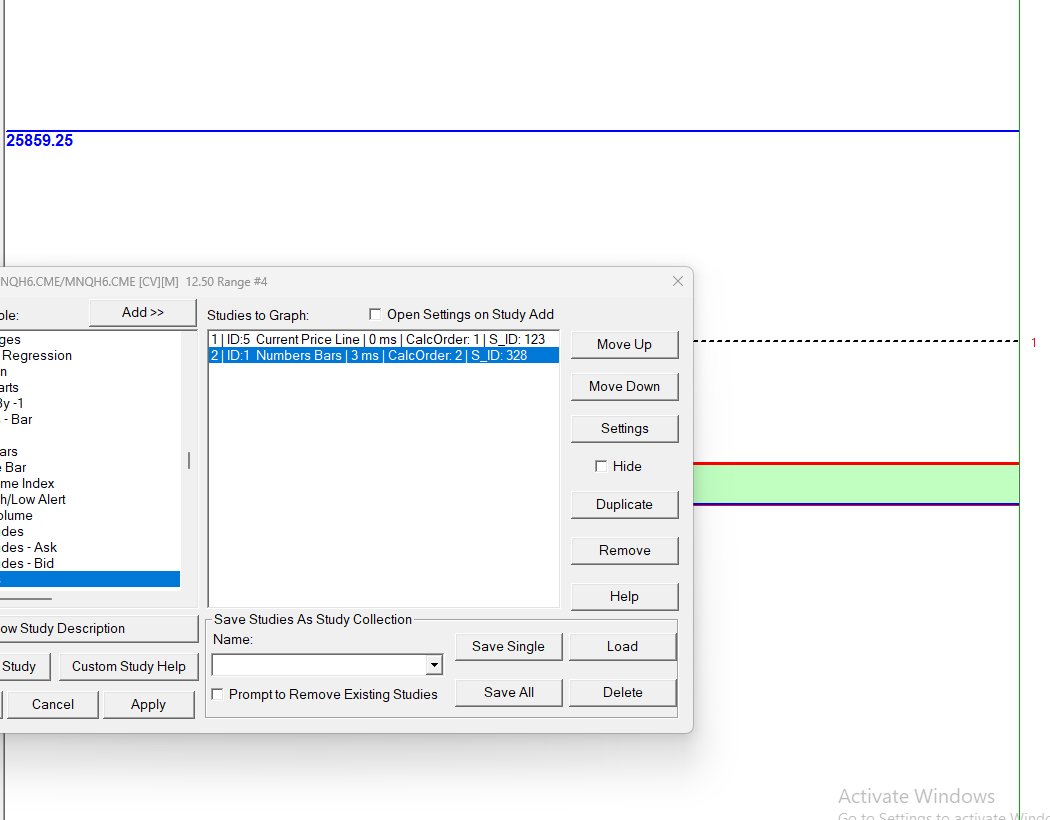 No you do not need Service Package 12. We want you to open a new Intraday chart for the symbol, and add the Numbers Bars study. Do you see the study? Sierra Chart Support - Engineering Level Your definitive source for support. Other responses are from users. Try to keep your questions brief and to the point. Be aware of support policy: https://www.sierrachart.com/index.php?l=PostingInformation.php#GeneralInformation For the most reliable, advanced, and zero cost futures order routing, use the Teton service: Sierra Chart Teton Futures Order Routing |