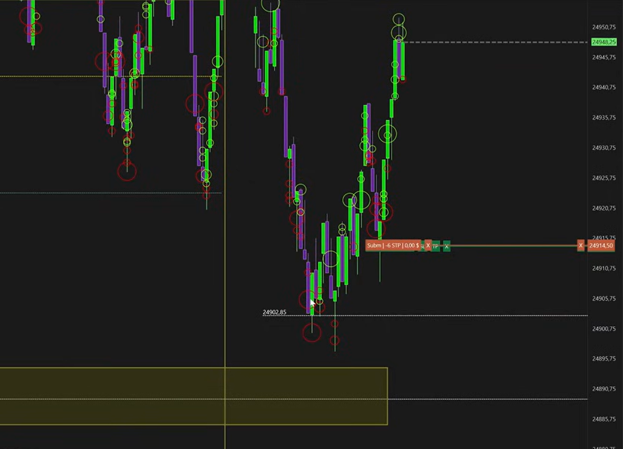 Hello, I am looking for any indicator or function of Sierra that would look at each price level on each candle and plot a circle or highlight when the Ask Vol Bid Vol difference is greater than 30. Additionally, I would love the color of the circle to coorespond with the direction of the delta, red for bid heavy, and green for ask heavy. Also, if possible, I want the size of the circle to increase if the delta is higher than 20. I've been playing around with the numbers bars study, and I can get shaded highlights for different percentages of bid ask difference, but no set level for above 30. I'm trying to replicate Fabio Valentinis scalping setup if that helps, thats where the screenshot is from. Thanks much! |